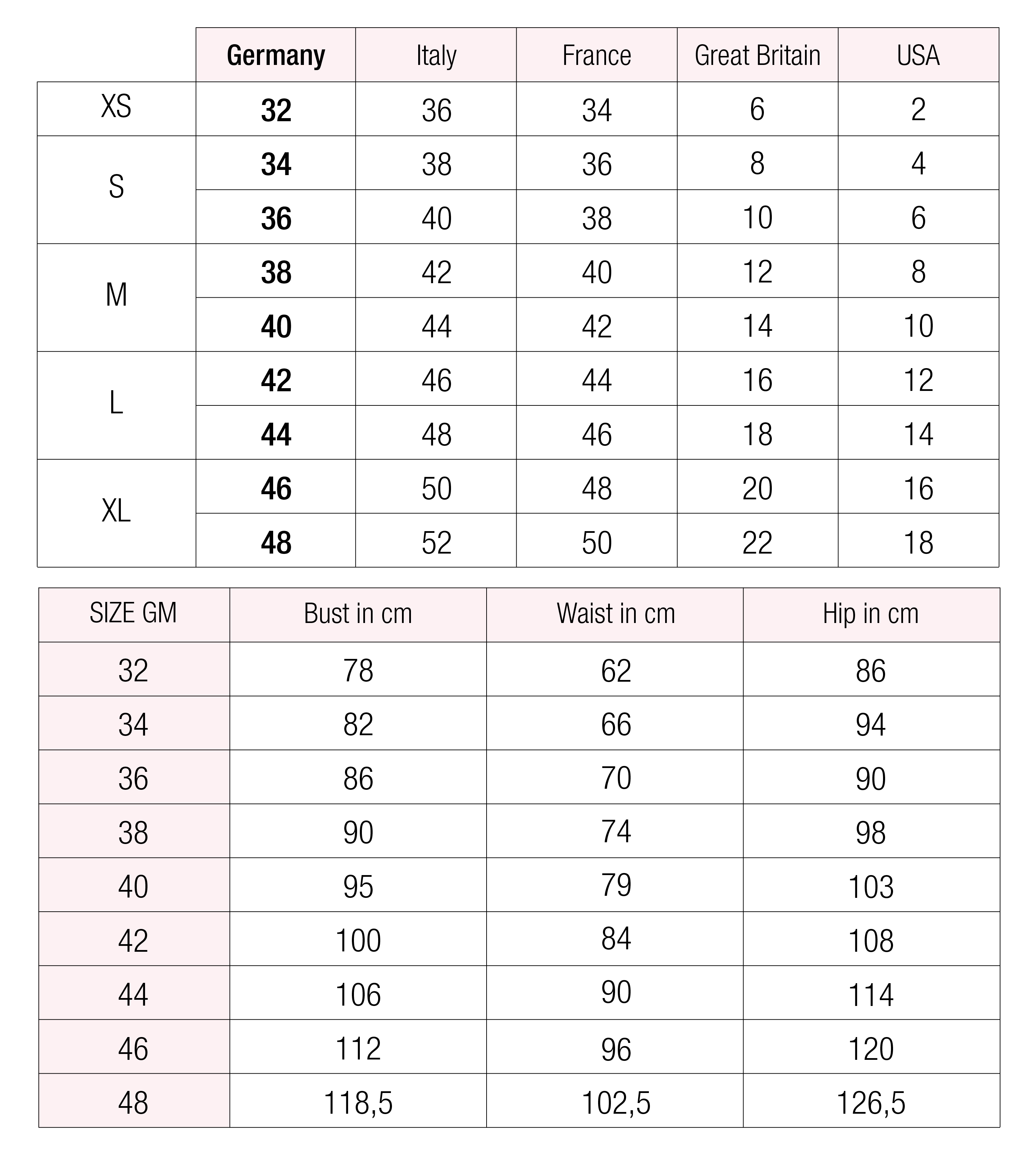 RIANI is characterised by unique fits, the highest standard of cut and quality as well as materials and design. To ensure that you order the right size and therefore the right fit, measure your body measurements. Below you will find a list of our manufacturer sizes with the corresponding EU conversion and measurements (in cm) for bust, waist and hips. Please note that these differ from other EU sizes and do not apply to accessories and shoes.
