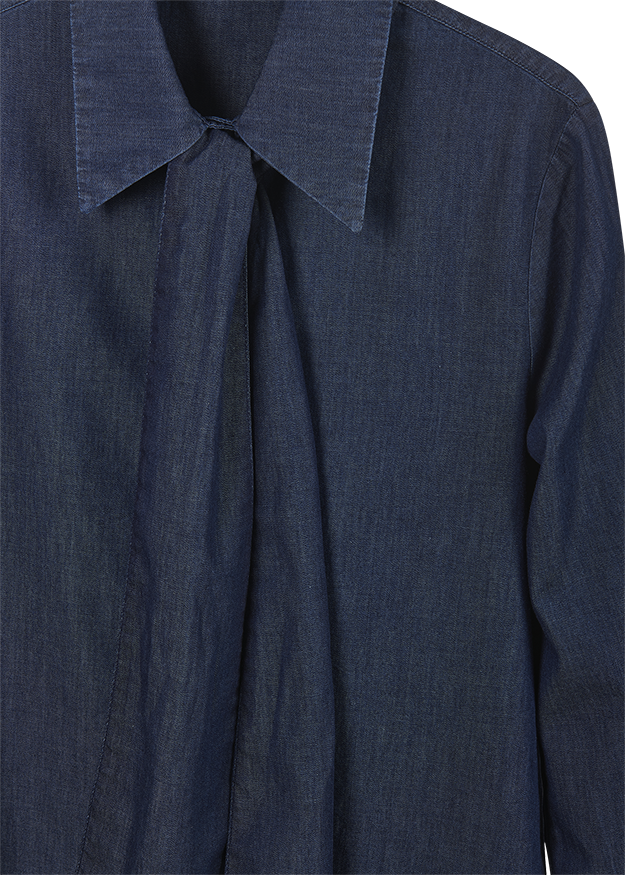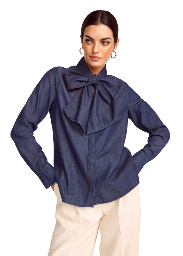 Ein tolles Piece für Fashionistas! Wer Denim liebt, kommt an dieser Bluse nicht vorbei. Sie ist aus sehr feinem Organic-Cotton-Denim gewebt und bildet einen spannenden Twist aus sportiv und schick. Ein modisches Highlight ist die große Schleife, die dem Hemdstyle das Besondere verleiht. Als Basic zu einem hellen Hosenanzug oder leger zur Jeanshose – es gibt viele Möglichkeiten.