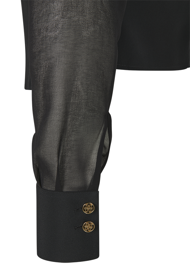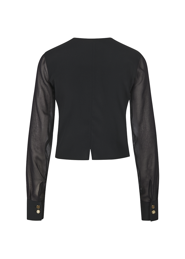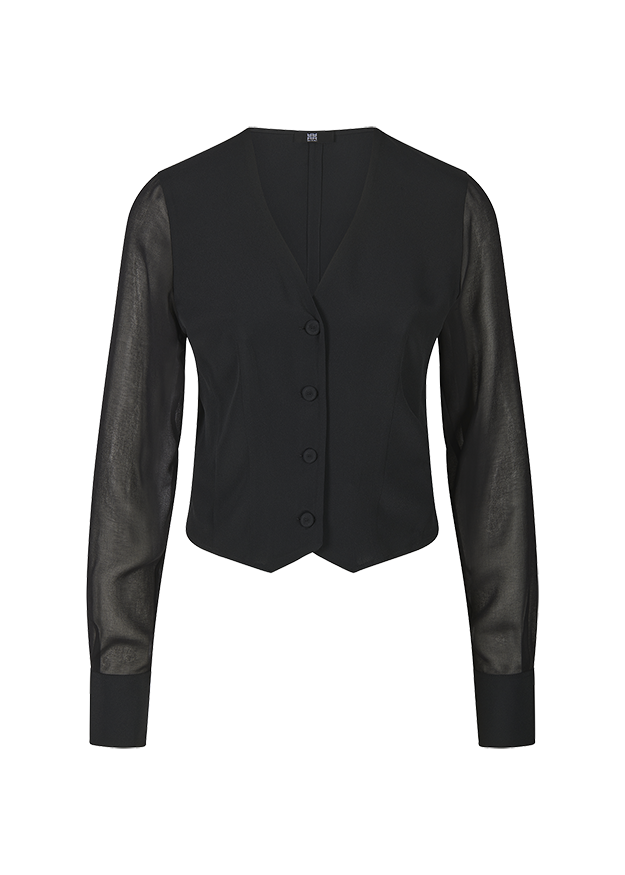 Lieblingsstück gefunden! Raffiniert kombiniert die modische Bluse den Style einer Weste mit halbtransparenten Ärmel. V-Ausschnitt, ein formschöner Schnitt und die Knopfleiste unterstreichen den Look. Das Ergebnis kann sich sehen lassen! Unser Tipp für ein hinreißendes Abendoutfit: Zu der Bluse trägt die RIANISTA eine goldglänzende Lederhose in Wide-Fit und flache Slipper.