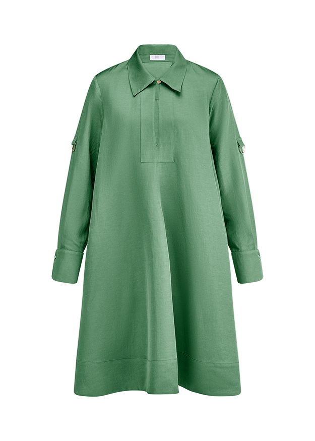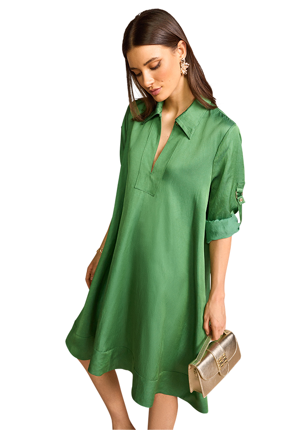 Luftig, leicht und elegant – das Satinkleid aus Livi Satin ist ein echter Hingucker. Der klassische Kragen verleiht dem Kleid zeitlose Raffinesse, während der lockere Schnitt und die krempelbaren Ärmel für angenehme Leichtigkeit sorgen. Der edle Glanz des Stoffes macht das Kleid zu einem stilvollen RIANI-Highlight, das sowohl chic als auch entspannt wirkt – einfach zum Verlieben!