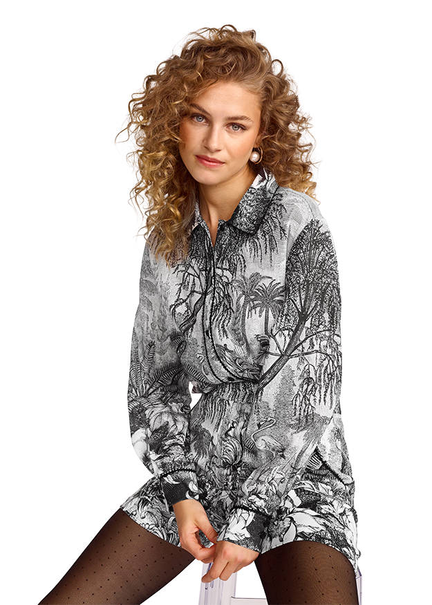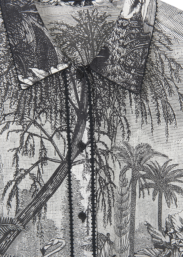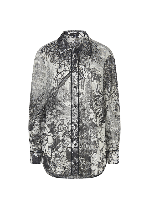 Klassische Bluse aus reiner Baumwolle mit exklusivem Print, der an den Besuch einer Fine Art Gallery denken lässt. Die exotischen Blumen, Bäume und Farne sind detailreich und wunderschön gezeichnet. Ein Basic also, das Eindruck macht und ein toller Eyecatcher ist. Sensationell ist die Kombination mit einem Unterteil wie Shorts oder Rock mit dem gleichen Print.