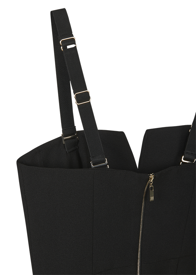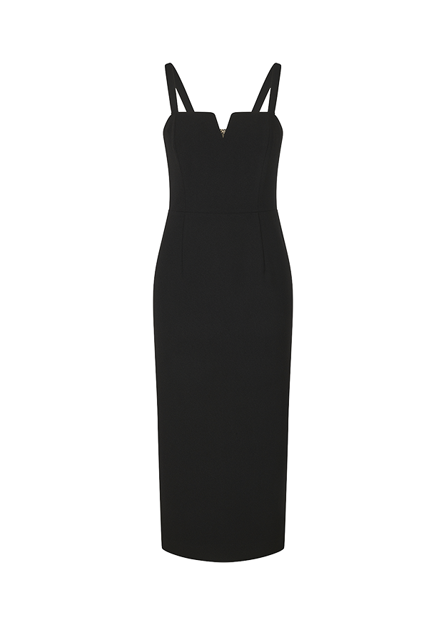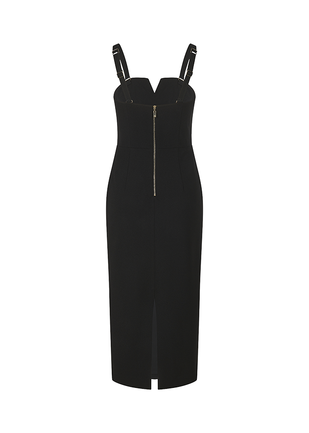 Für sophisticated Ladys, die modisch-elegante Looks lieben, ist dieses Kleid die perfekte Wahl. Die Silhouette ist schmal gehalten, der kleine V-Cut im geraden Ausschnitt setzt von vorne einen stylishen Akzent, der sich am Rücken widerspiegelt. Ein langer Reißverschluss und ein sexy Saumschlitz runden das Design ab. Je nach Wunsch lässt sich das Kleid mit und ohne Träger tragen.