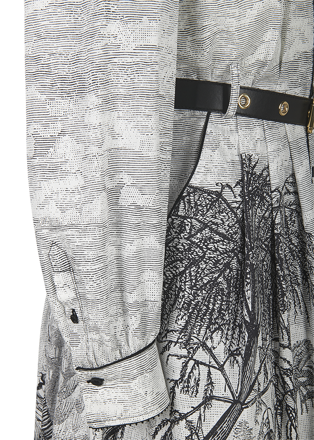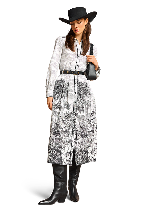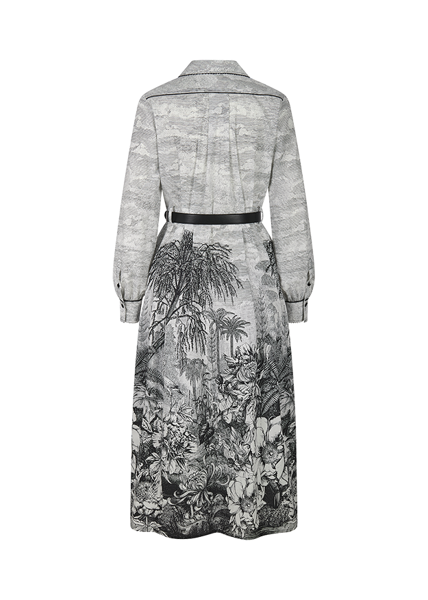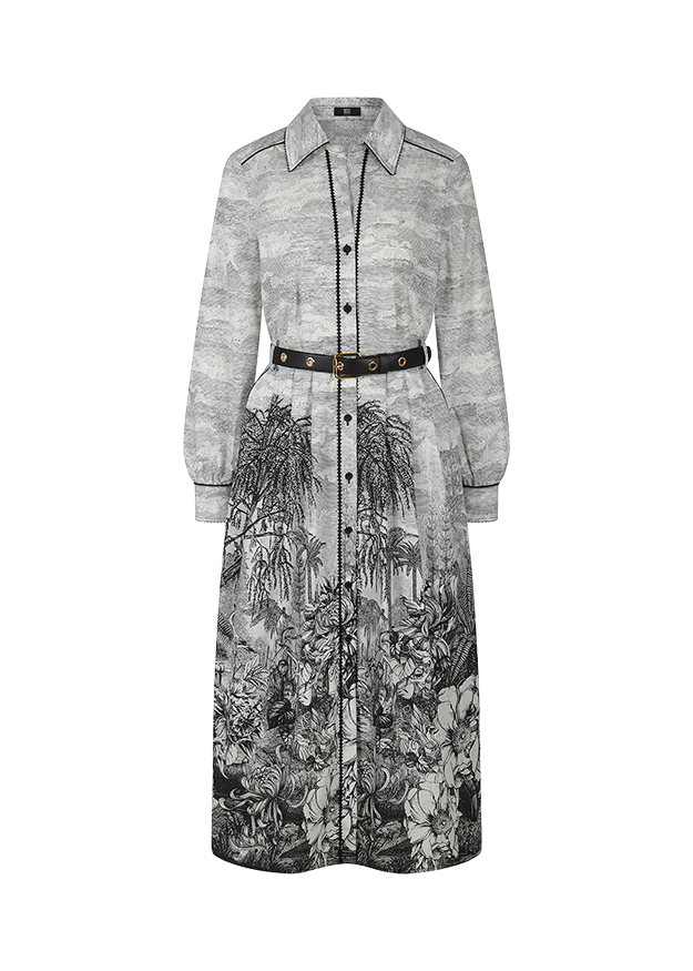 Eleganz trifft auf Kunst: Das Hemdblusenkleid besticht durch seinen einzigartigen High-Class-Print, der an die feinen Linien eines Kupferstichs erinnert. Der Kragen und die durchgehende Knopfleiste verleihen dem Kleid einen klassischen Look, der Gürtel betont die Taille. Lange Ärmel mit Manschetten und der gerade Schnitt sorgen für eine bequeme Passform und machen das Piece zu einem stilvollen Highlight für jede Garderobe.