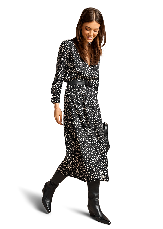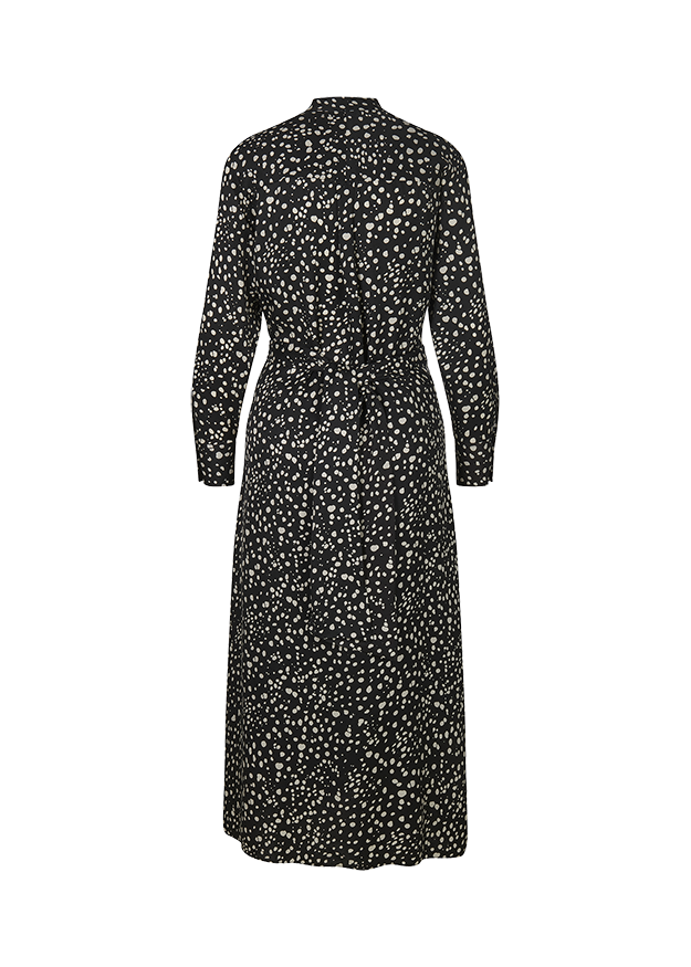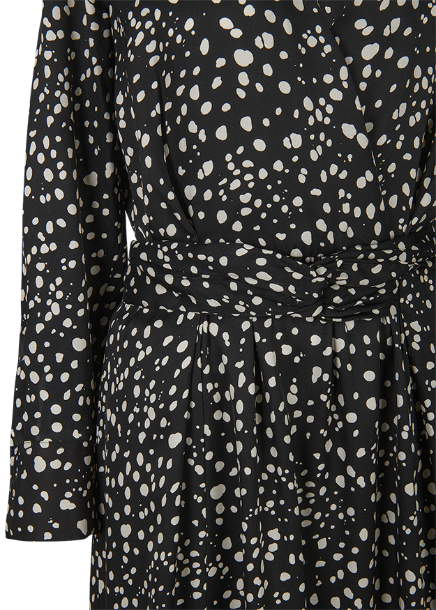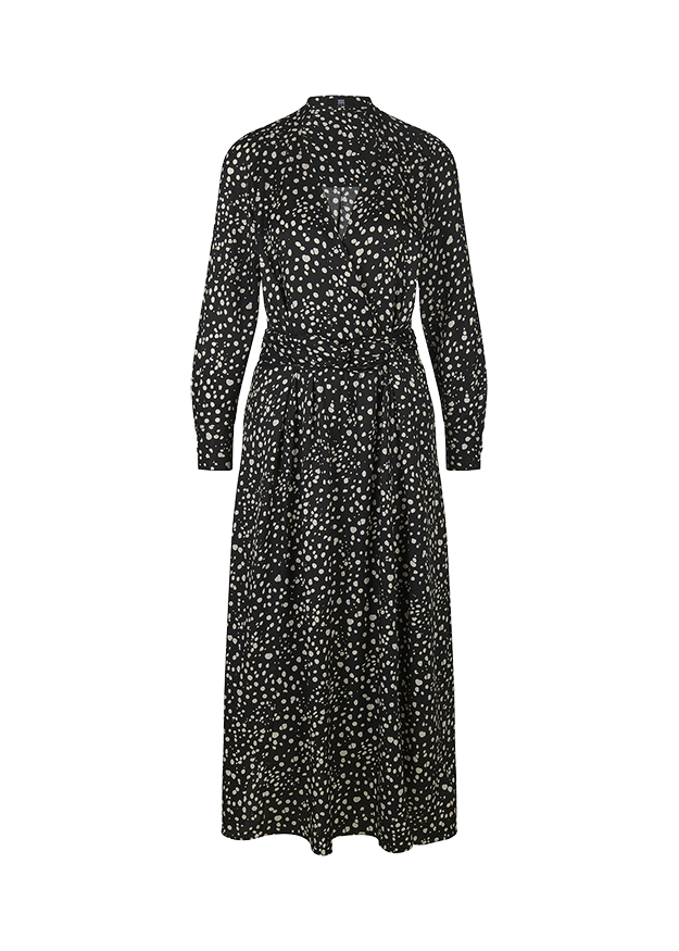 Ein Kleid, das durch sein punktiertes Muster und den weichen Viskosestoff besticht. Der V-Ausschnitt und die langen Ärmel verleihen dem Kleid eine edle Ausstrahlung, während der schmale Gürtel die Taille perfekt betont. Das fließende Material bietet nicht nur Bewegungsfreiheit, sondern auch einen hohen Tragekomfort. Ein modisches Highlight für verschiedenste Gelegenheiten.