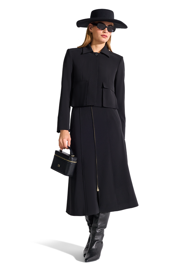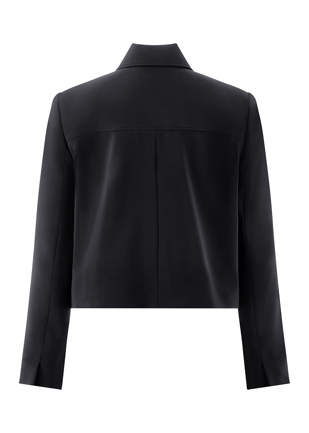Die RIANI kurze Jacke mit klassischem Kragen besticht durch ihre klare Linienführung und moderne Silhouette. Der kurze Schnitt und die markanten Pattentaschen setzen stylishe Akzente, während der hochwertige, pflegeleichte Stoff mit leichter Elastizität für ein komfortables Tragegefühl sorgt. Ein vielseitiges Key-Piece, das Deinem Look eine selbstbewusste und elegante Note verleiht – perfekt für Büro und Freizeit.