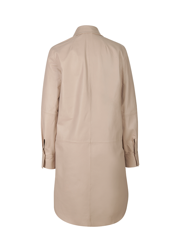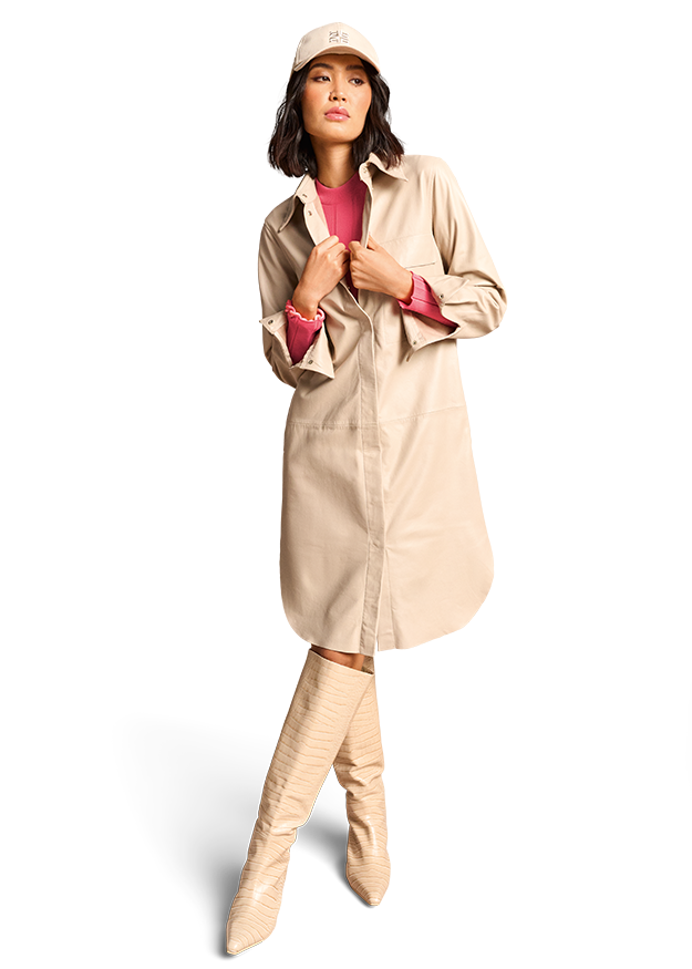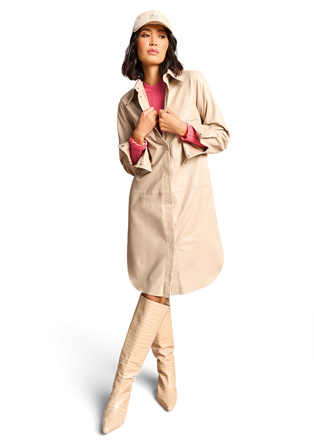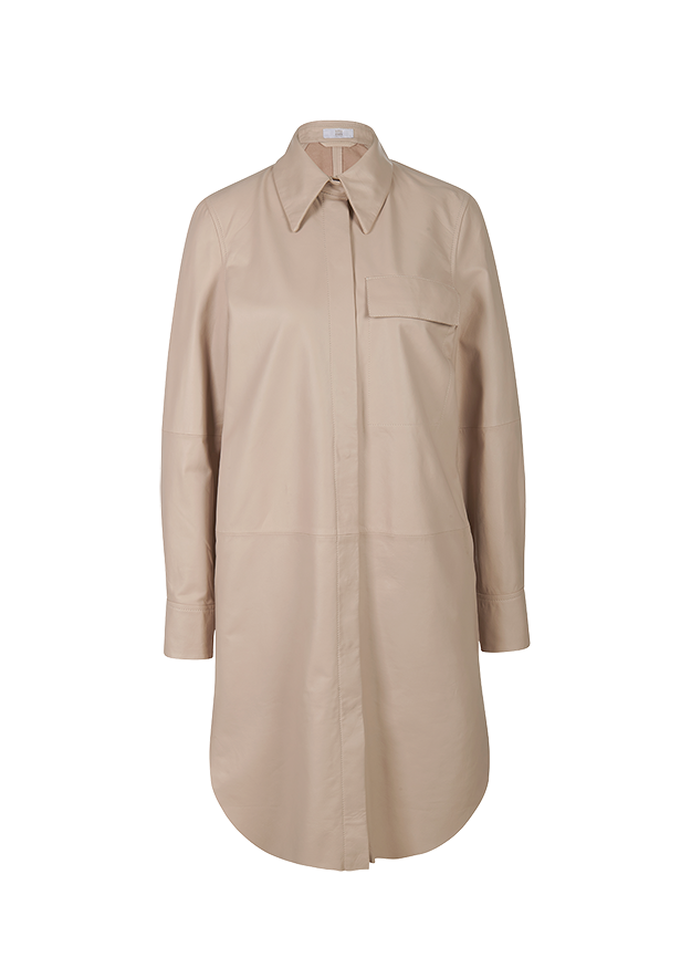 Moderner Style. Cleanes Design trifft auf edles Lammnappa-Leder und macht das Kleid zum exquisiten Styling-Favoriten. Der abgerundete Saum betont die modische Länge, die verdeckte durchgängige Knopfleiste unterstreicht das minimalistische Design. Durch den gerade Schnitt lässt es sich auch gut mit einem Shirt oder Longsleeve kombinieren.