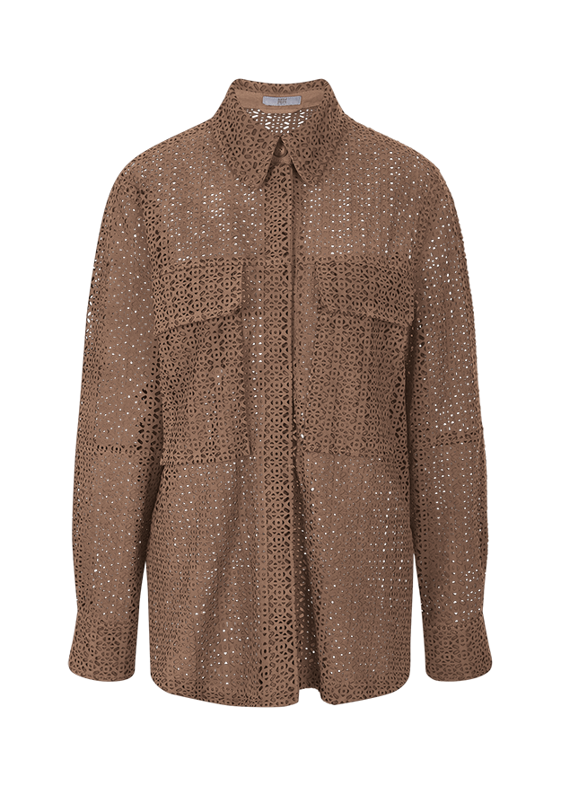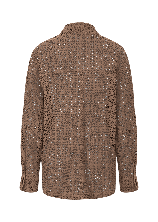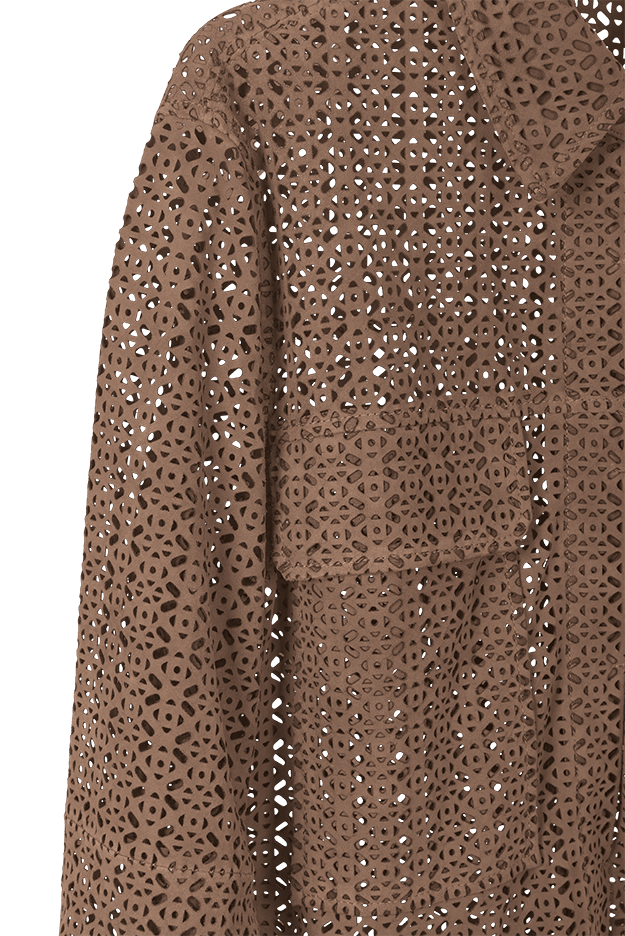 Cooles Fashion-Piece mit 70s-Vibes! Diese RIANI-Hemdbluse aus hochwertigem Ziegenvelours mit filigranem Lasercut-Muster vereint Leichtigkeit mit einem Hauch von Retro-Coolness und garantiert Dir einen stilvollen Auftritt. Besonders gut kommt sie in Kombination mit Bermuda-Shorts oder einem Denim-Rock zur Geltung – diese Premium-Bluse im soften Beigeton 'Sahara' ist ein absoluter RIANISTA-Liebling!