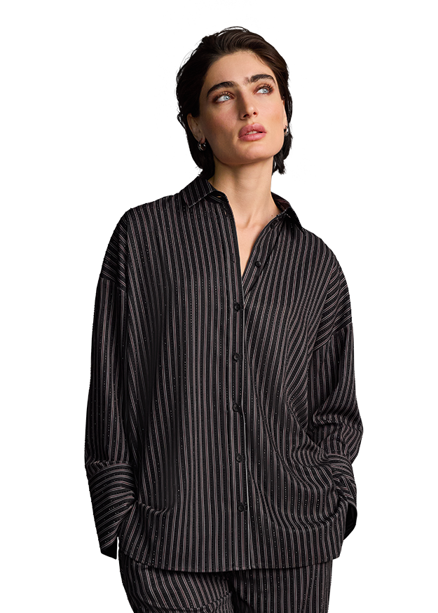 Glamourös und entspannt – diese Bluse setzt den Abendlook perfekt in Szene! Die feinen Blusenstreifen in einem angesagten Morelloton werden durch glitzernde Kristalle auf dem Stoff perfekt in Szene gesetzt. Der abgerundete Saum, der klassische Kragen und die Knopfleiste verleihen ihr das typische Hemdgefühl. Der angenehme Baumwoll-Mix sorgt Komfort und Stil. Kombiniert mit der passenden Wide Fit Hose entsteht der ultimative, elegante Pyjama-Look – trendy und trotzdem komfortabel!