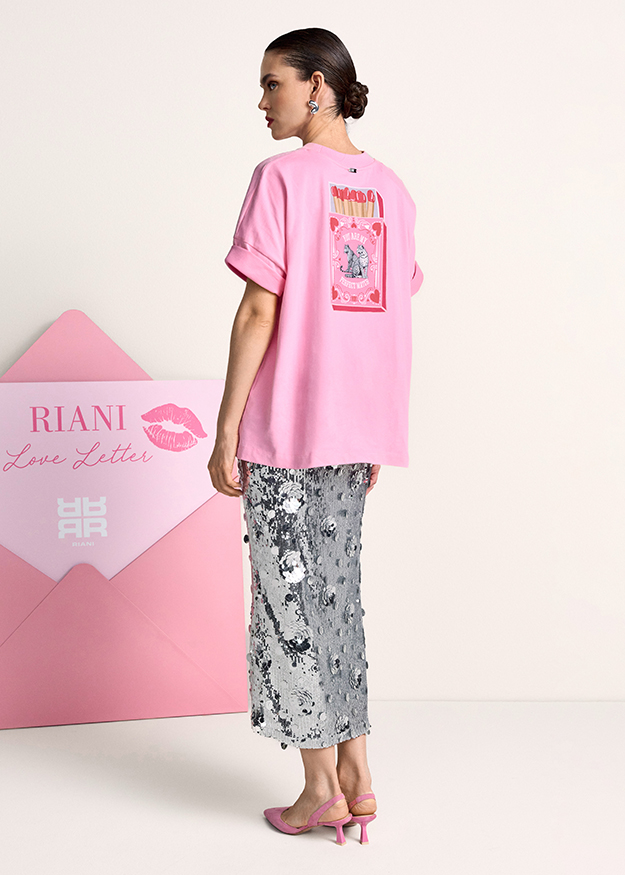 Ein verspieltes Statement in zarten Rosato-Tönen – das 1/2-Arm T-Shirt von RIANI kombiniert Komfort mit auffälligen Prints! Der klassische Rundhalsausschnitt und das weiche 100 % Baumwollmaterial sorgen für ein angenehmes Tragegefühl, während der Aufdruck „PERFECT MATCH“ auf der linken Brust und das Motiv „YOU ARE MY PERFECT MATCH“ auf dem Rückenteil alle Blicke auf sich ziehen. Ob casual zu Jeans und Sneakers, locker über einem Rock oder als verspielter Akzent unter einer offenen Jacke – dieses It-Piece bringt moderne Frische und femininen Charme in jeden Look und ist ein Must-have für RIANISTAs, die Statement-Shirts mit Liebe zum Detail lieben.