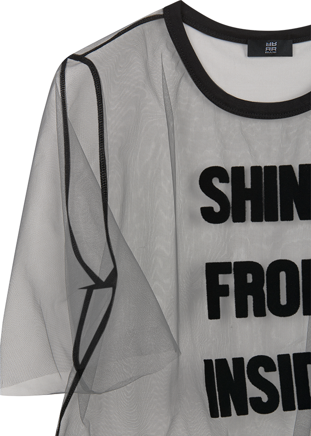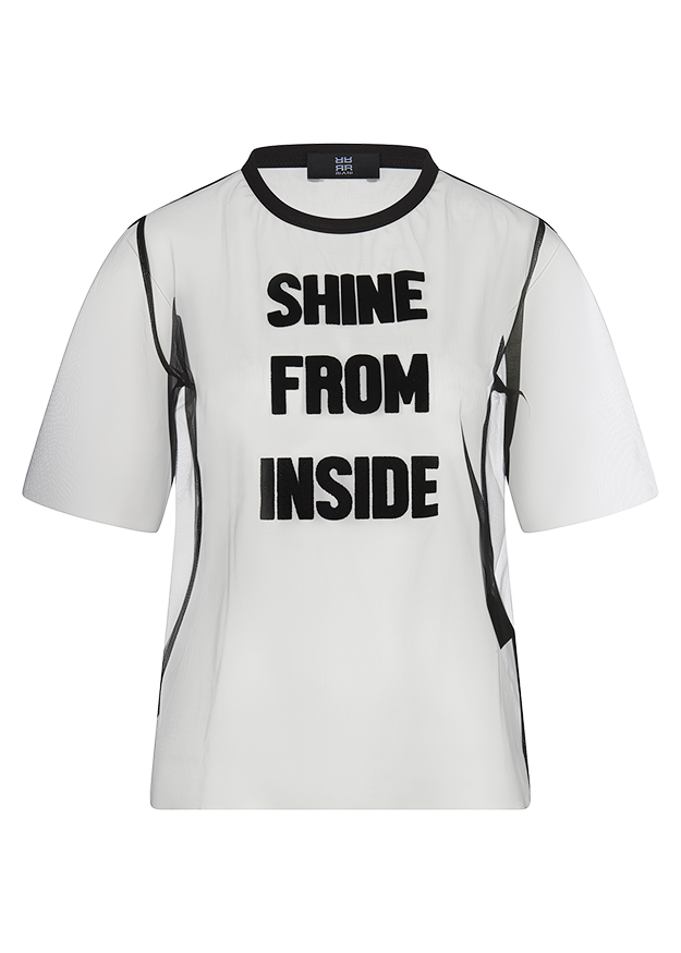 Basic-Upgrade! Modisches Statement-Shirt aus feinstem Tüll. „Shine from inside“ ist die Botschaft des Styling-Piece. Ideal für coole Looks ist die Kombination mit unserem Rollkragenshirt aus Skinsoft de Luxe, das superweich auf der Haut liegt und durch seinen dünnen Stoff eine tolle Ergänzung ist. Aber auch ein weißes Shirt ist eine super Alternative.