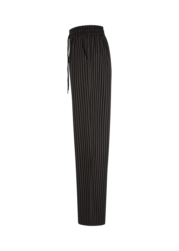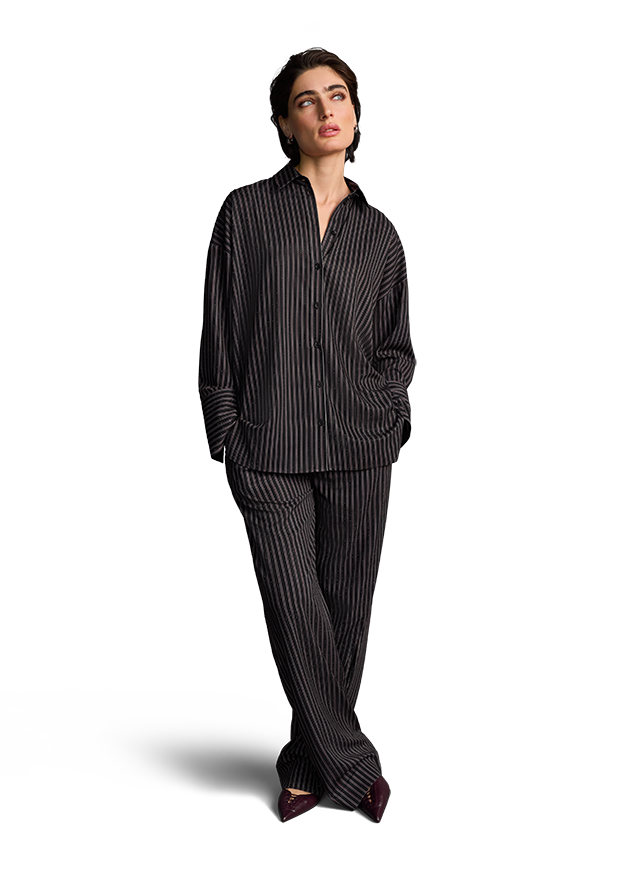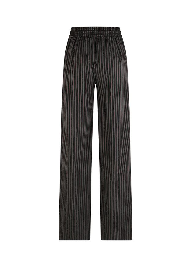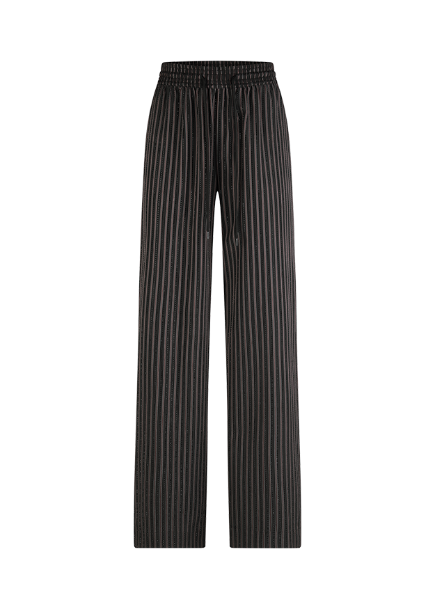 Unsere Wahl bei RIANI zwischen Chic & Bequemlichkit heißt: Wir nehmen beides! Diese Hose im angesagten Pyjama-Look ist schnell angezogen und sorgt sofort für einen stilvollen Auftritt – komfortabel und elegant zugleich. Der Wide Fit Schnitt garantiert Bequemlichkeit, während die Streifen in Morelloton und glitzernde Kristalle das Highlight setzen. Perfekt für einen trendigen, entspannten Look, der gleichzeitig chic wirkt!