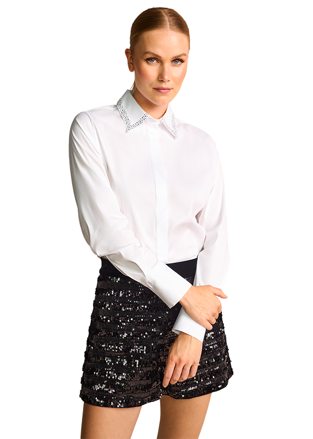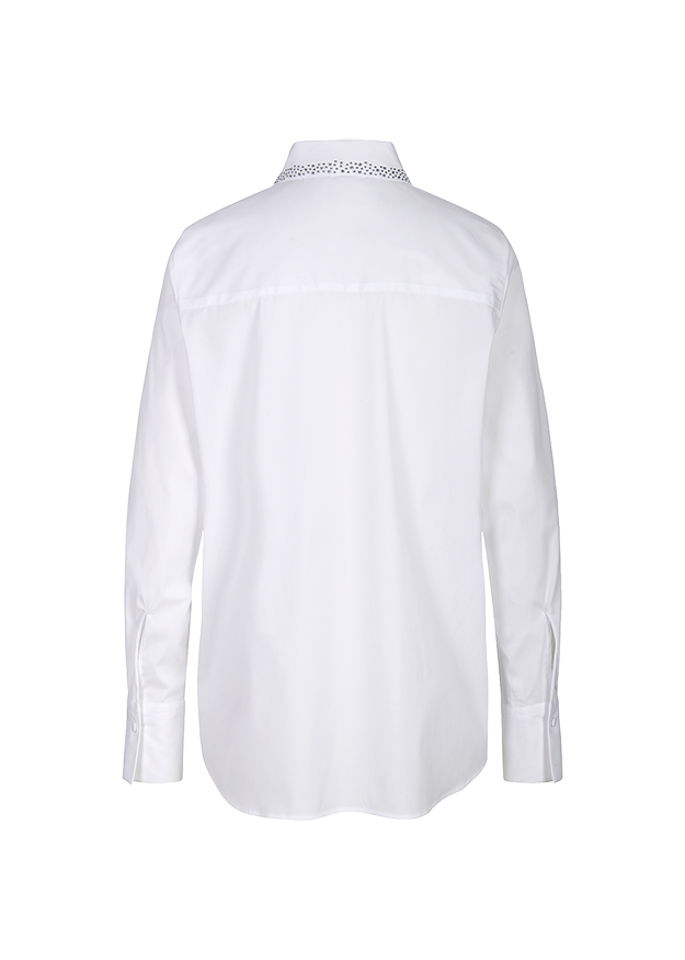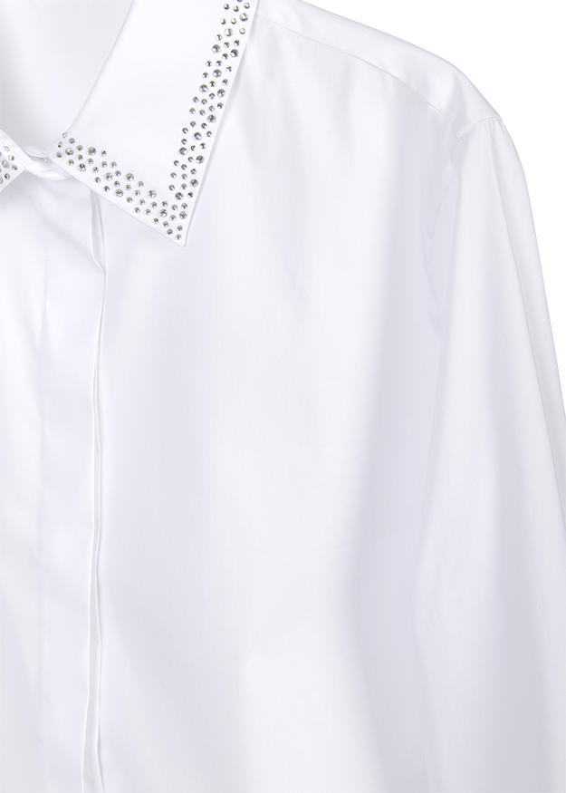 Eye-catching: classic, elegant design meets glittering rhinestones. This beautiful blouse made from stretch poplin fabric has a popular shirt blouse style. The rhinestone-studded collar adds sparkles. The concealed button placket creates a clean look and emphasises its timeless look. Perfect for combining with elegant and casual outfits, it adds a subtle touch of glamour to any outfit.