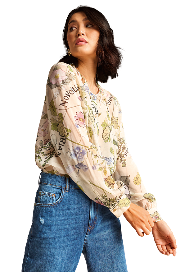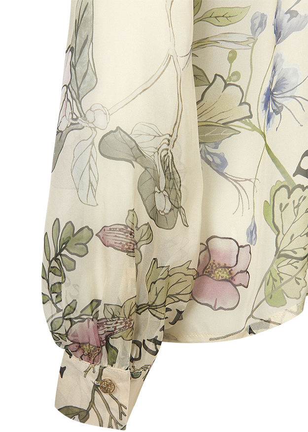A floral dream! This lightweight, semi-sheer blouse made of pure viscose will enchant you with its beautiful botanical print. Large flowers alternate with decorative lettering. It adds femininity to any look and also adds an exciting twist or two. We love the combination with casual jeans and trainers, for example. Just give it a try!