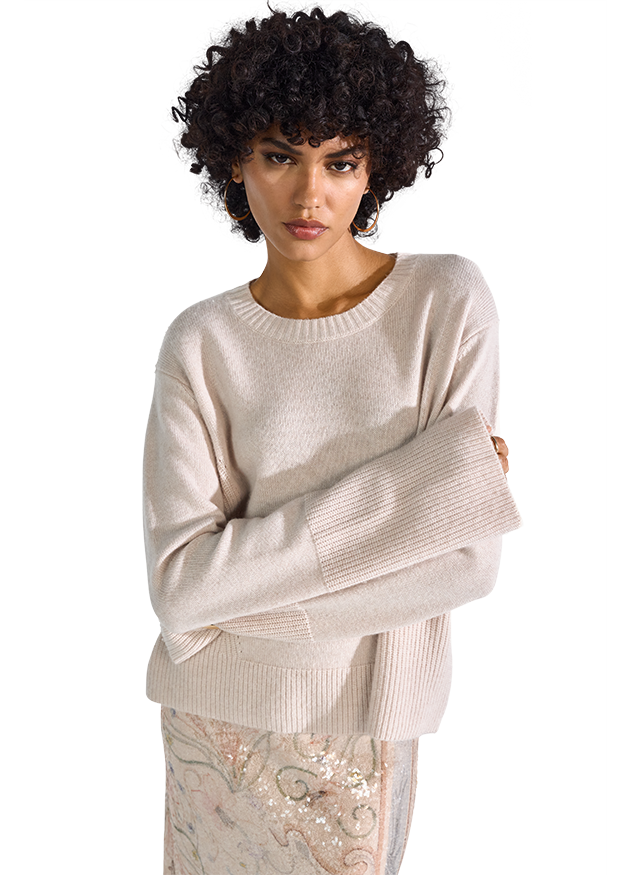 The RIANI cashmere jumper is pure cosiness with style! With its clean, straight cut and soft cashmere blend, it envelops you like a luxurious hug. The elegant gold buttons on the sleeves are the perfect detail for a look that works both casually and elegantly. Whether for a relaxed office style or a chic city look, this jumper is your new all-rounder for cool days.
