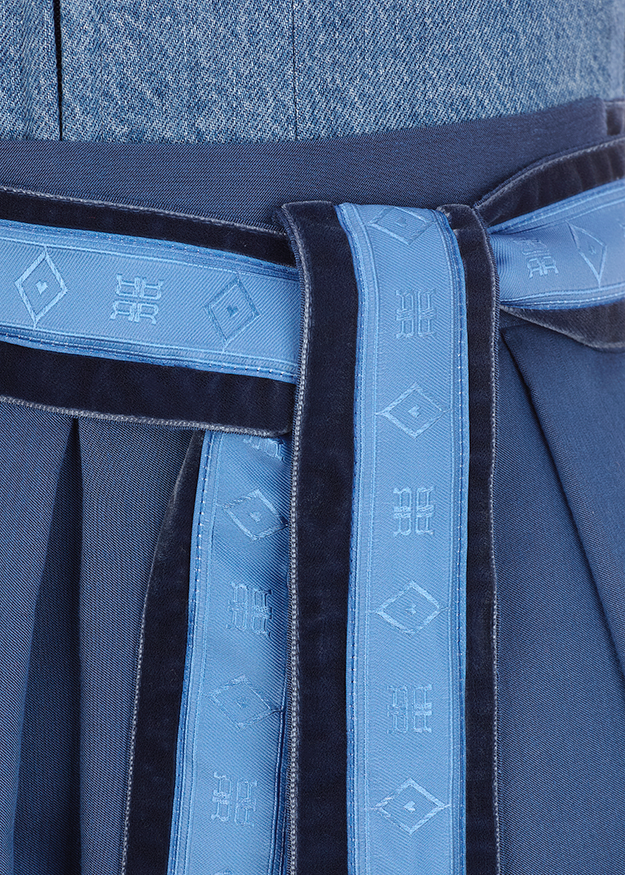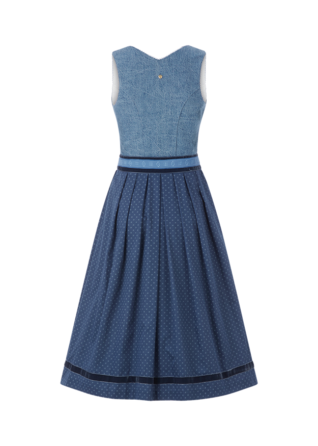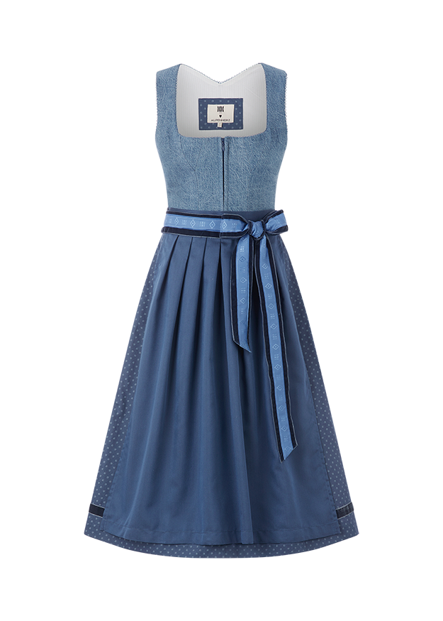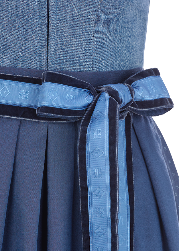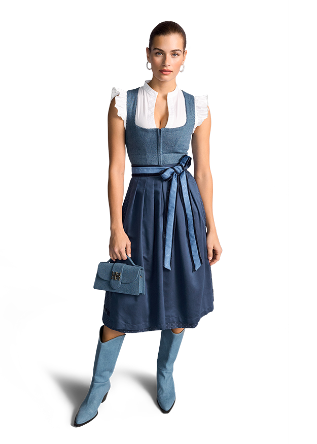 Something new, something blue! The RIANI x AlpenHerz denim dirndl is the modern interpretation of traditional costume. A white winged blouse and denim accessories round off the look perfectly. The dirndl is smaller, so we recommend choosing one size larger than your usual RIANI size. If you already know your AlpenHerz size, we recommend ordering this size.