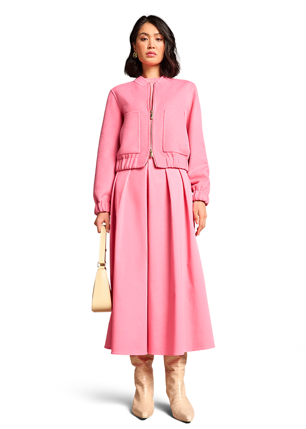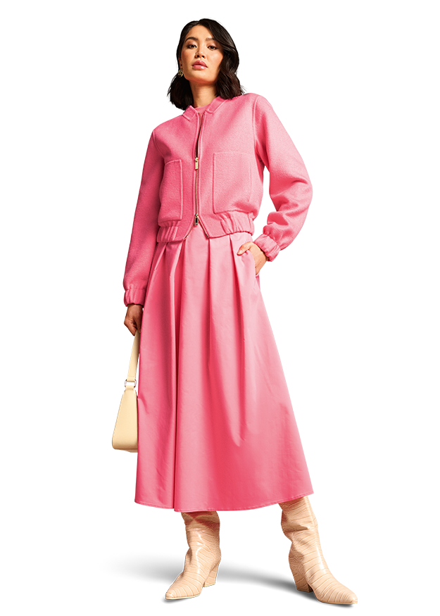 Cutting-edge casual chic: this stylish A-line skirt made of innovative Japanese stretch taffeta is a great piece for any wardrobe. It can be combined in a variety of ways and is suitable for a wide range of styles – from everyday to events. RIANISTAS wear it with a transparent blouse made of Black Blossom tulle and shiny leather boots, for example.