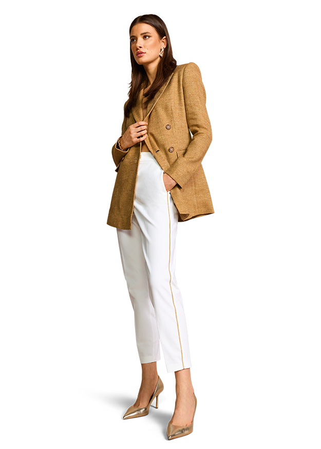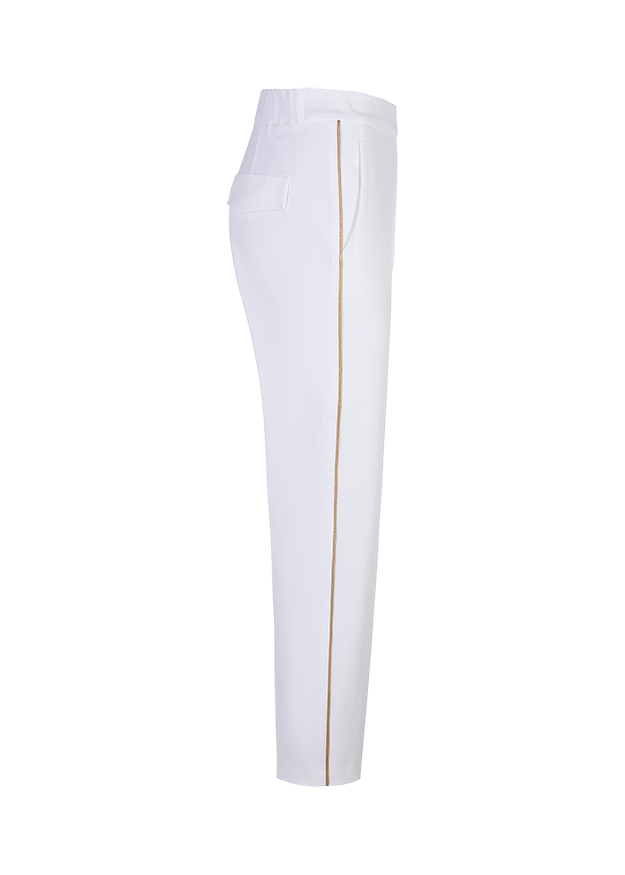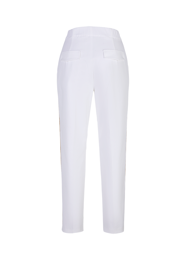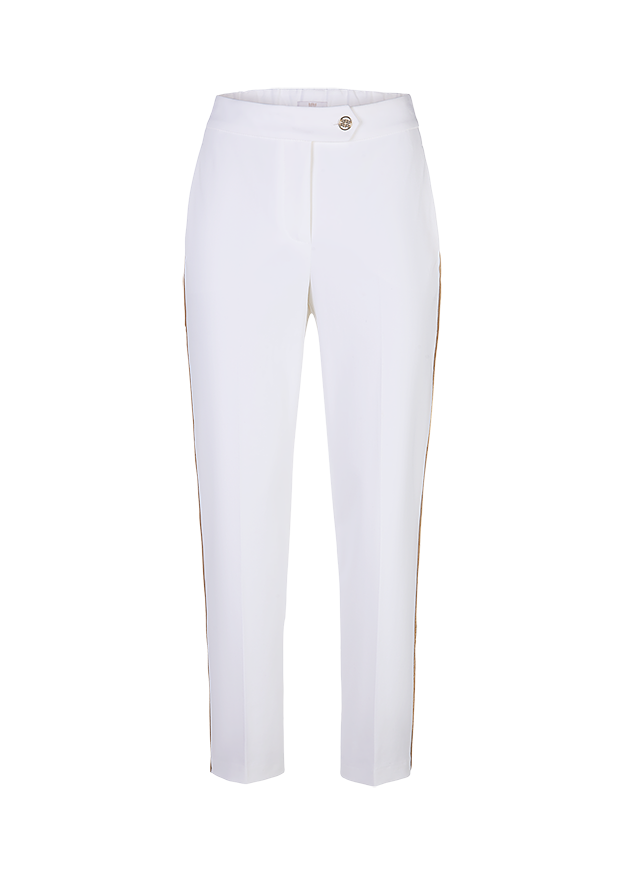Sporty meets premium chic! The side stripes give the RIANI slim-fit trousers for women a cool twist. Made from super comfy, high-quality organic cotton stretch, they are not only stylish, but also environmentally friendly. With casual side slit pockets and a cropped fit, they can be worn elegantly with a blazer or casually with a jumper.