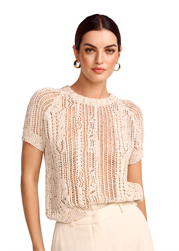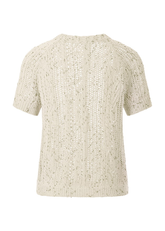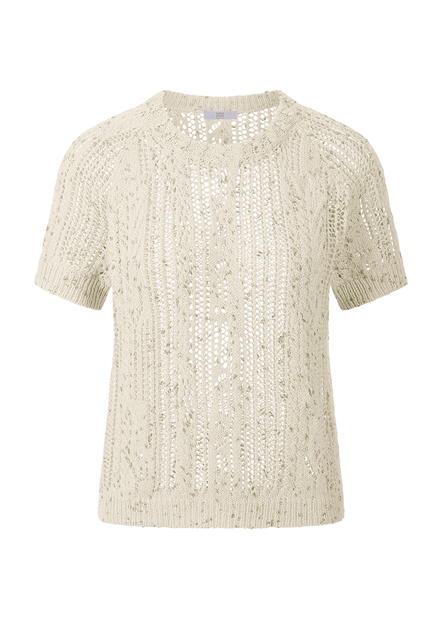Pure glamour in eco glam - this RIANI jumper with a round neckline and short sleeves in the beige shade ‘Dune’ is so stylish! However, it not only impresses with its glamorous look, but also with its sustainability. With 52% recycled cotton, this shimmering it-piece for women is particularly environmentally friendly. Perfect for combining with suit trousers!