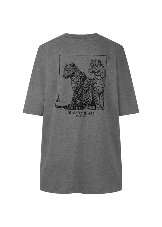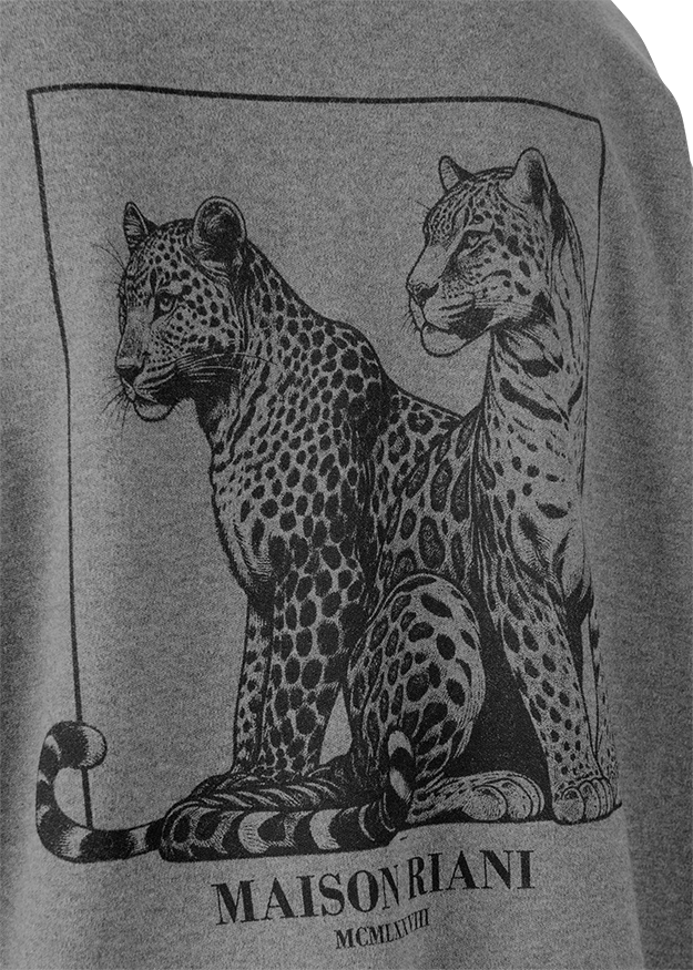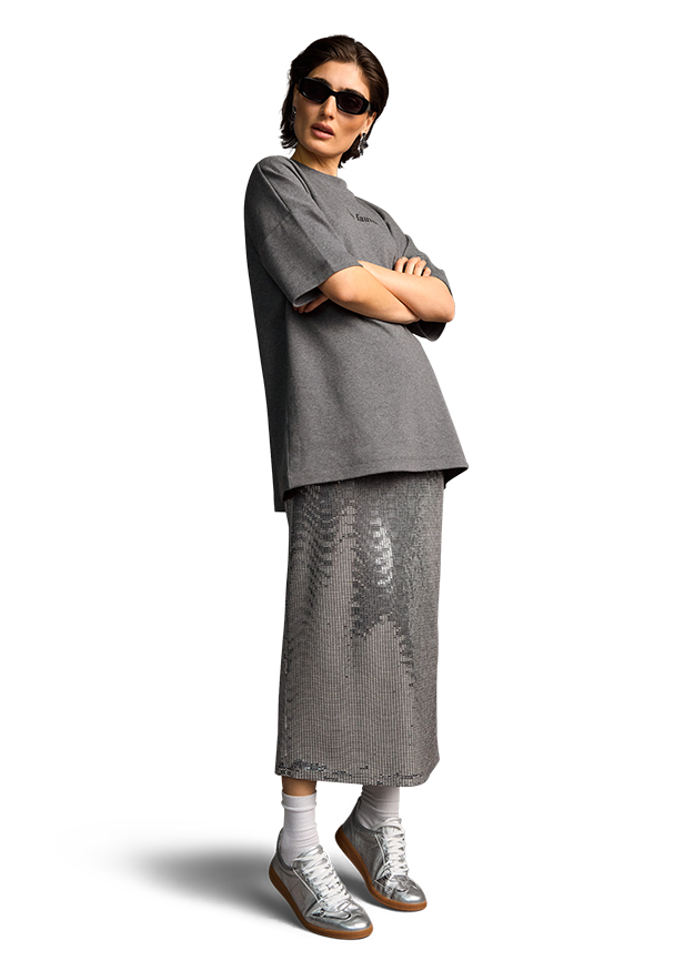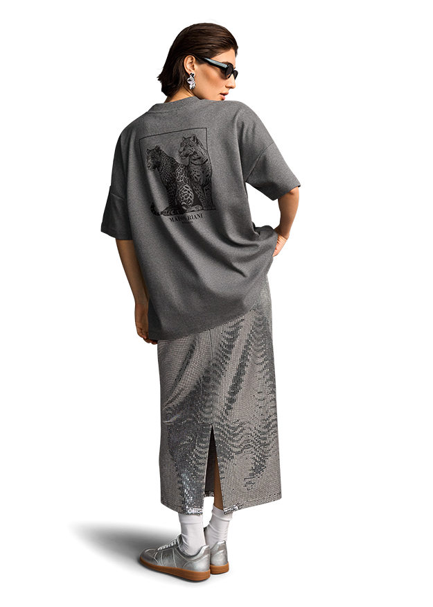At first glance, the T-shirt from RIANI with the simple lettering ‘Lev Fauves’ looks inconspicuous, but ‘Les Fauves’ translates as ‘The Wild Ones’ - and that's exactly what the back print with two cheetahs shows. This gives the look a wild, powerful touch. Combined with our disco ball skirt, the result is a look that is sure to impress.