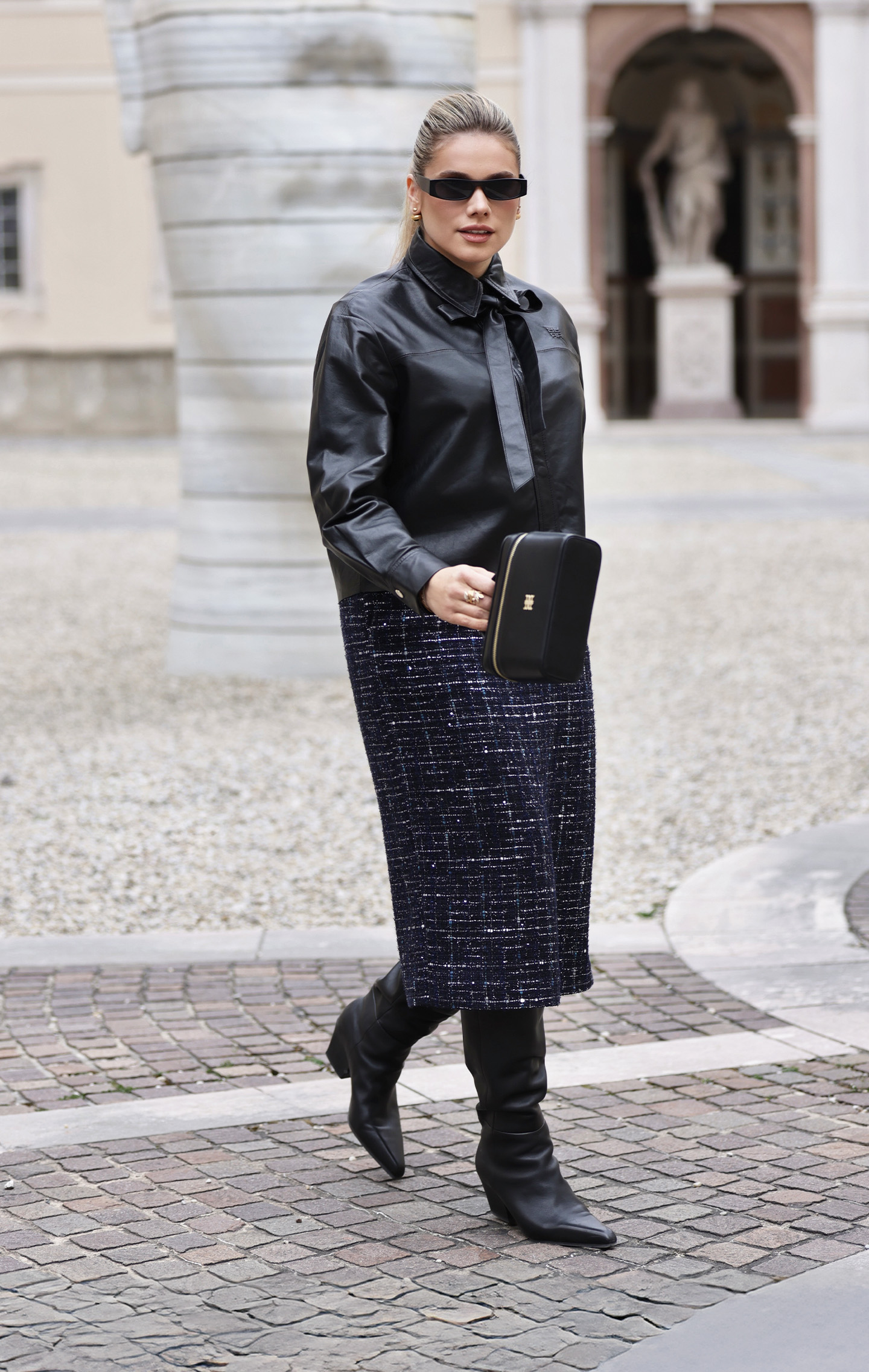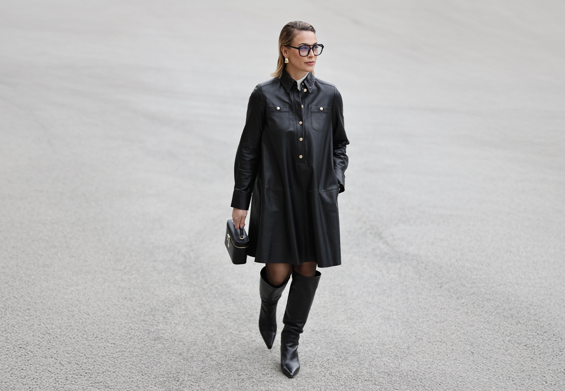 This black mini leather dress is the perfect statement piece for the new season! Made from soft, high-quality leather, it impresses with its luxurious texture, first-class workmanship and unparalleled comfort. The design with long sleeves, button placket and classic shirt collar combines feminine elegance with a modern, edgy look. The mini length makes the dress particularly versatile: whether worn solo for elegant dinner looks, with boots for a cool street style or layered for office styles – this leather dress adapts effortlessly to any occasion. The soft, high-quality material ensures comfort and freedom of movement, while the black leather gives every outfit a stylish, premium character. With the right accessories, the dress becomes the perfect, timeless fashion statement – edgy, elegant and always modern.